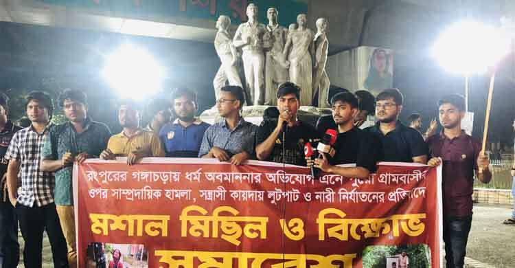 রংপুরের গঙ্গাচড়ায় ধর্ম অবমাননার অভিযোগে গ্রামবাসীর ওপর সাম্প্রদায়িক হামলা, সন্ত্রাসী কায়দায় লুটপাট ও নারী নির্যাতনের প্রতিবাদে মশাল মিছিল ও সমাবেশ করেছে ঢাকা বিশ্ববিদ্যালয়ের (ঢাবি) জগন্নাথ হলের একদল শিক্ষার্থী।